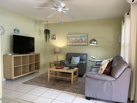 Wohnzimmer, Küche, Essbereich, Schlafzimmer mit Kingsize Bett Badezimmer, Klimaanlage, WLAN und Kabel-TV.